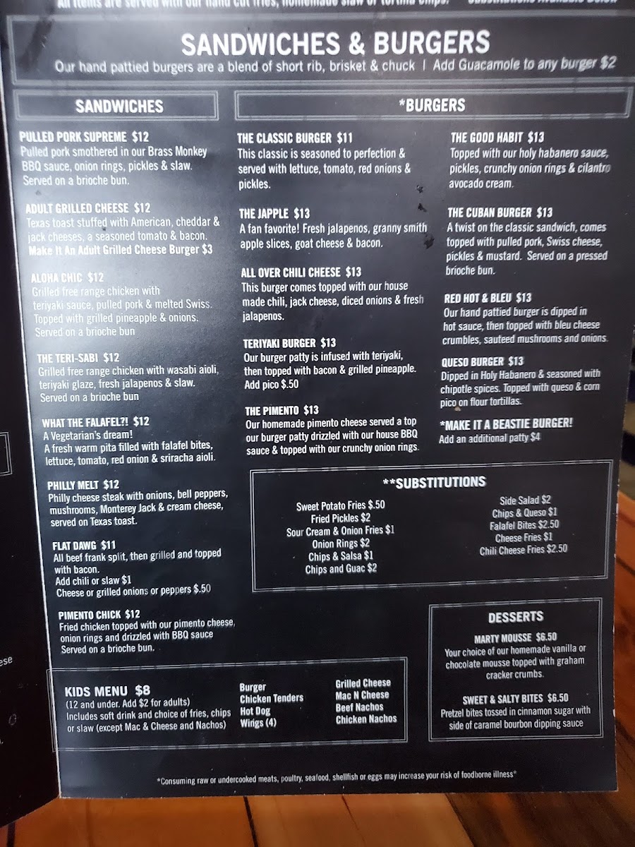 Pulled pork smothered in our brass monkey BBQ sauce, onion rings, pickles, and our slaw.
